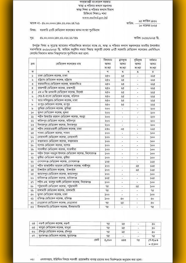 আসন পুনর্বিন্যাসের চিঠির তথ্য বিশ্লেষণে দেখা গেছে, ৩৭টি সরকারি মেডিকেল কলেজে আসন ছিল ৫ হাজার ৩৮০টি। এবার ১৪টি মেডিকেল কলেজে ৩৫৫টি আসন কমানো হয়েছে। আর তিনটি মেডিকেল কলেজে ৭৫টি আসন বাড়ানো হয়েছে। এতে বর্তমানে মেডিকেল ভর্তিতে আসনসংখ্যা কমে দাঁড়িয়েছে ৫ হাজার ১০০টি।