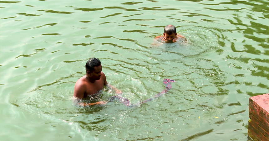 নবাববাড়ি পুশকুনিতে গোসল করছেন সাধারণ মানুষ |ছবি: এখন টিভি