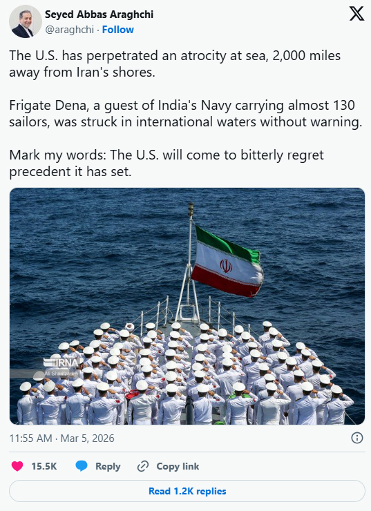এক্সে দেয়া পোস্টে আব্বাস আরাঘচি বলেন, ‘যুক্তরাষ্ট্র সমুদ্রে এক ‘‘নৃশংসতা’’ ঘটিয়েছে, ইরানের উপকূল থেকে ২,০০০ মাইল (৩,২১৯ কিলোমিটার) দূরে।’
