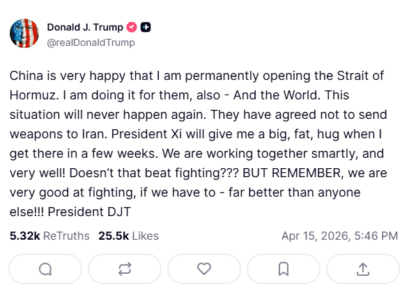 আজ (বুধবার, ১৫ এপ্রিল) সামাজিক যোগাযোগমাধ্যম ট্রুথ সোশ্যালে দেয়া এক পোস্টে ট্রাম্প লিখেছেন, ‘চীন খুবই খুশি যে আমি হরমুজ প্রণালি স্থায়ীভাবে খুলে দিচ্ছি। আমি এটা তাদের জন্যও করছি—এবং বিশ্বের জন্যও। এই পরিস্থিতি আর কখনো ঘটবে না।’