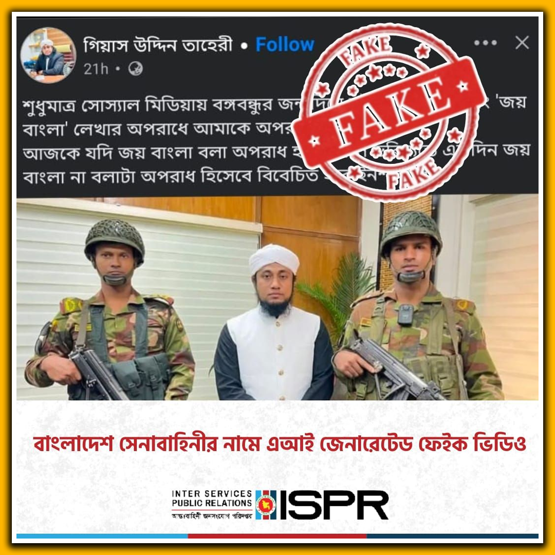 বিজ্ঞপ্তিতে বলা হয়, ‘সম্প্রতি লক্ষ্য করা যাচ্ছে, বাংলাদেশ সেনাবাহিনীকে কেন্দ্র করে সামাজিক যোগাযোগ মাধ্যমে বিভিন্ন ধরনের এআই-জেনারেটেড কনটেন্ট প্রচার করা হচ্ছে। “গিয়াস উদ্দিন তাহেরী” নামক একটি পেজ থেকে সেনাবাহিনীর নামে এআই-জেনারেটেড একটি ফেক ভিডিও আপলোড করা হয়েছে।’
