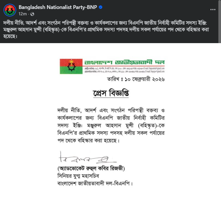 বিজ্ঞপ্তিতে বলা হয়, দলীয় নীতি, আদর্শ এবং সংগঠন পরিপন্থী বক্তব্য ও কার্যকলাপের জন্য বিএনপি জাতীয় নির্বাহী কমিটির সদস্য ইঞ্জিনিয়ার মঞ্জুরুল আহসান মুন্সীকে (বহিষ্কৃত) বিএনপি'র প্রাথমিক সদস্য পদসহ দলীয় সকল পর্যায়ের পদ থেকে বহিষ্কার করা হয়েছে।
