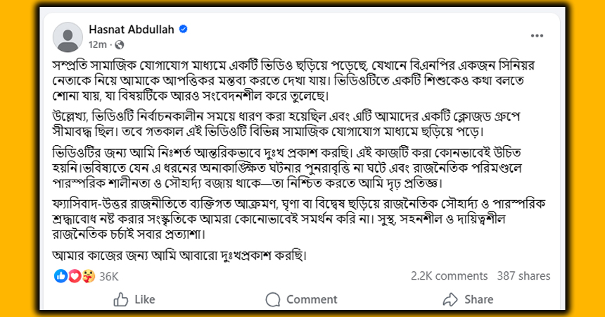 তিনি লেখেন, ‘ভিডিওটির জন্য আমি নিঃশর্ত আন্তরিকভাবে দুঃখপ্রকাশ করছি। এই কাজটি করা কোনোভাবেই উচিত হয়নি। ভবিষ্যতে যেন এ ধরনের অনাকাঙ্ক্ষিত ঘটনার পুনরাবৃত্তি না ঘটে এবং রাজনৈতিক পরিমণ্ডলে পারস্পরিক শালীনতা ও সৌহার্দ্য বজায় থাকে—তা নিশ্চিত করতে আমি দৃঢ় প্রতিজ্ঞ।’